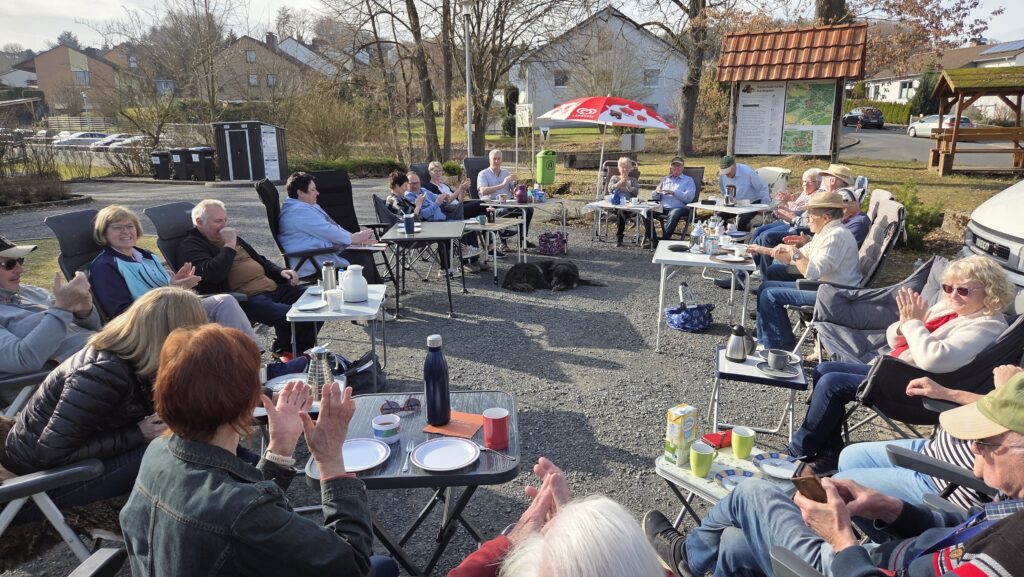 Erika und Siggi, unsere Organisatoren, begrüßten die Gruppe und gaben den Startschuss zum Stürmen des Kuchenangebots. In entspannter Atmosphäre tauschten alle Neuigkeiten aus und genossen das schöne Wetter im Freien.