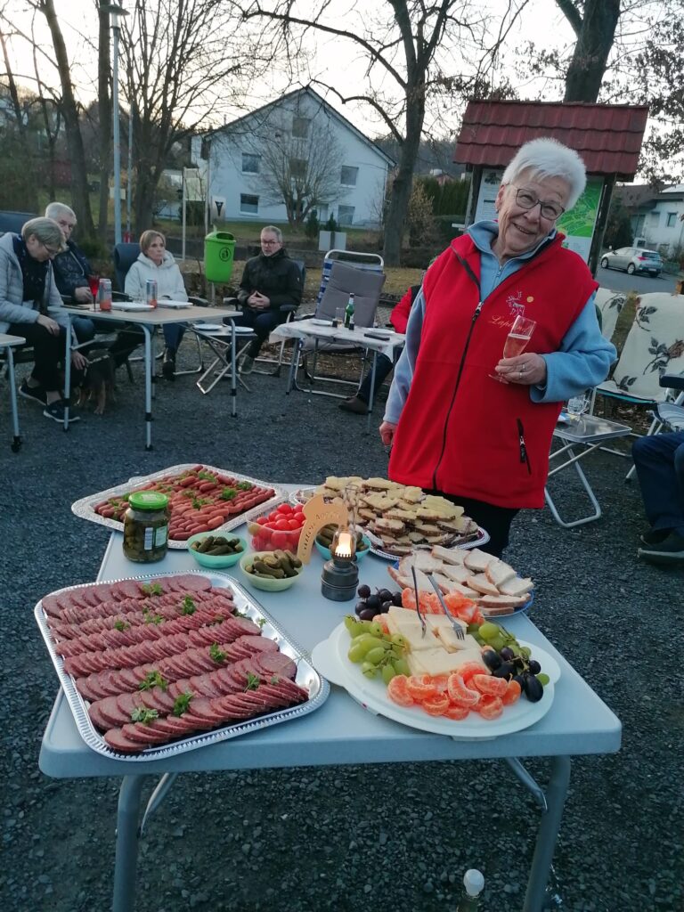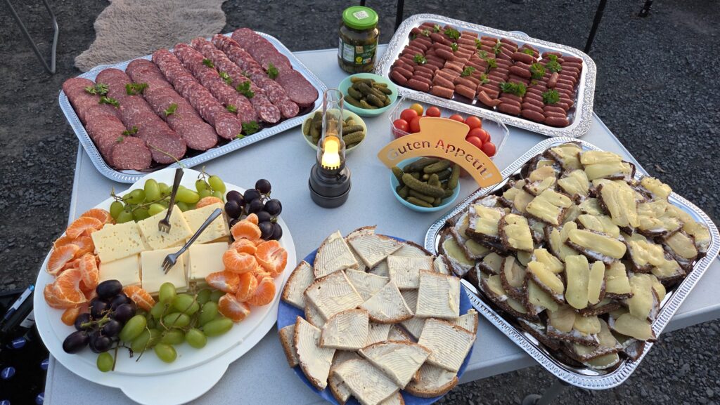 Ab 18:00 Uhr wurde zum Abendessen eingeladen. Erika hatte unter Mithilfe von Karin W. Schmalzbrote und allerhand weitere, kalte Köstlichkeiten vorbereitet. Da uns das Wetter weiterhin hold war, haben wir uns das Essen draußen in geselliger Runde schmecken lassen. Mit einem gespendeten Kasten Bier, Sekt und Cremelikör ließ die Gruppe den Abend gemütlich ausklingen. In geselliger Runde wurde noch erzählt und gelacht, bis die Kälte in die Glieder fuhr und sich die Runde nach und nach auflöste.
